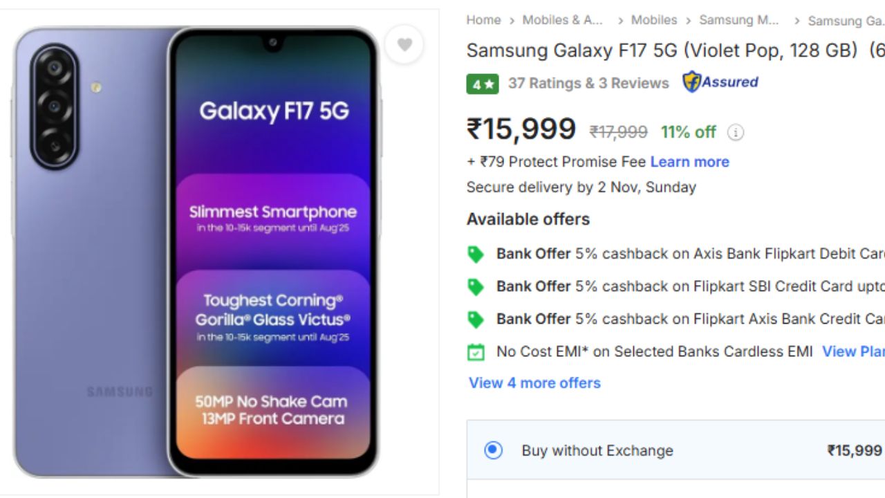 अब बात करते हैं इस धमाकेदार ऑफर की, जिसने मार्केट में तहलका मचा दिया है। Samsung Galaxy F17 5G की असली कीमत करीब ₹17,999 रखी गई थी, लेकिन अब आप इसे ₹7,000 तक की सीधी छूट के साथ खरीद सकते हैं। ऑफर के तहत इस फोन की कीमत घटकर ₹14,999 से ₹15,999 के बीच आ गई है। यानी एक शानदार 5G स्मार्टफोन अब मिड-रेंज प्राइस में आपका हो सकता है।